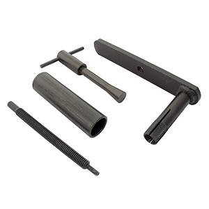 To use, simply screw the threaded rod into the cartridge. Insert the tube over the rod and the valve body. Place the crank over the rod and screw it down, seating the crank over the tube to remove the cartridge.