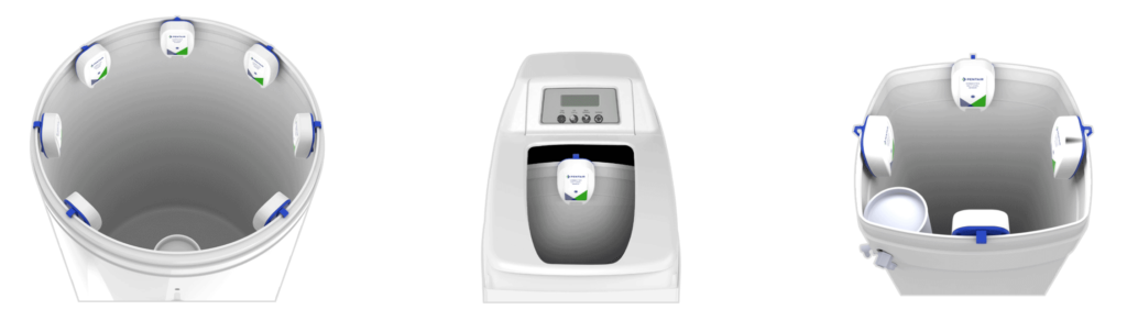 The universal tank clip allows for multiple mounting options and fits easily side-by-side in square and round brine tanks, and within cabinet-style brine tanks.