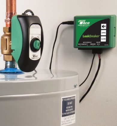 The Taco LeakBreaker is installed on the incoming cold water supply to the water heater, shutting off the water to a leaking water heater. The plumb-and-plug design is specifically engineered for use on a new or retrofit installation. Components are pre-wired to simplify the installation process, just plug in the sensor, valve, power supply and/or batteries. LeakBreaker can be tested anytime and then be reset to guard against a future leak.