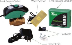 The Taco LeakBreaker is a water heater leak protection device that protects against flood damage from the containment failure of a water heater. It consists of a control unit, valve with actuator and sensor.