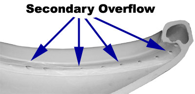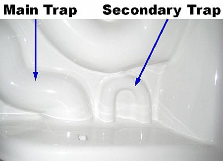 If a blockage occurs and the toilet clogs up, water continues to rise until it reaches the primary overflow holes. At this point, the water drains through the secondary system bypassing the main trap and drains directly into the sanitary main.